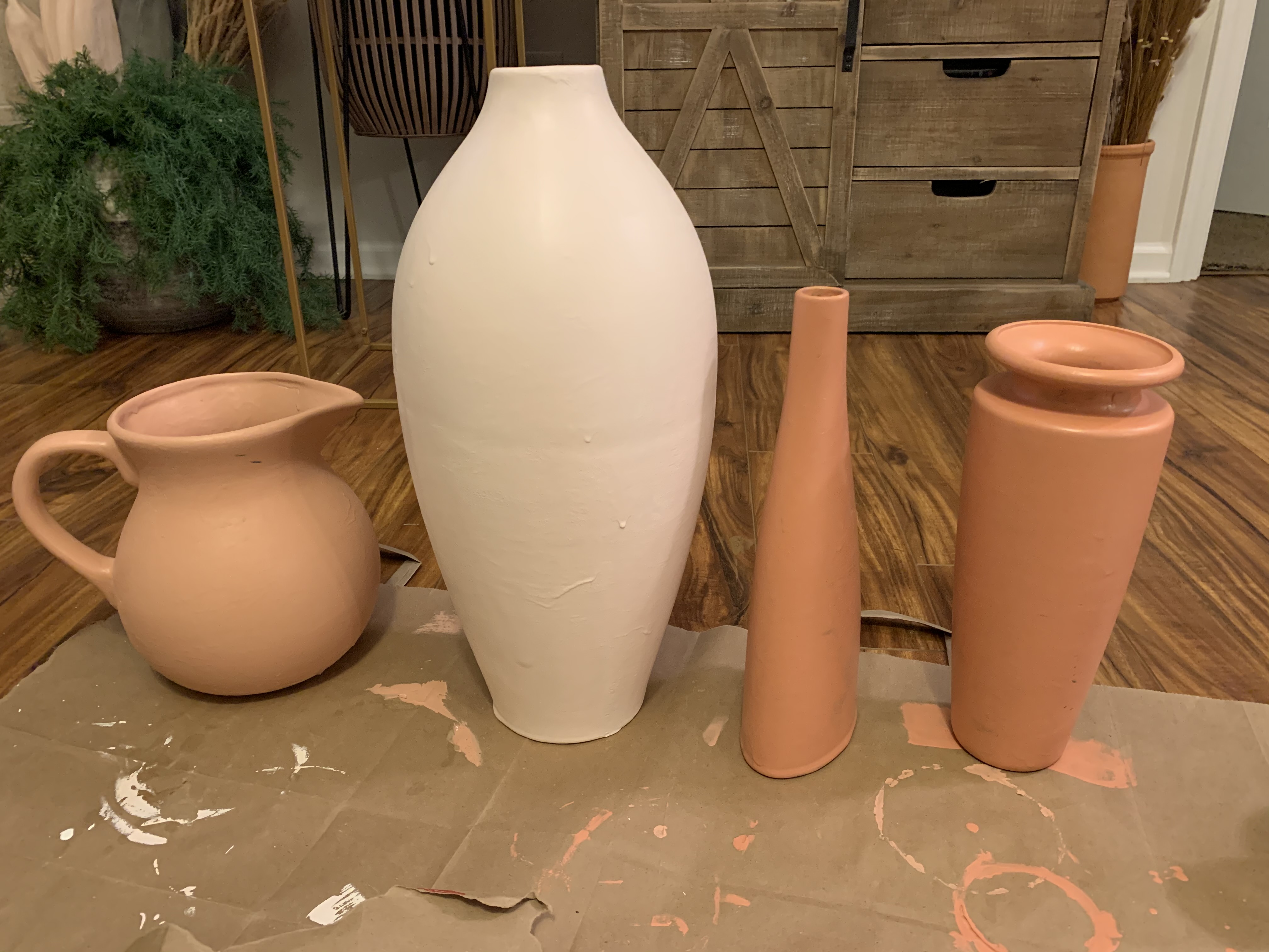 Pictured are four I did because it’s kind of therapeutic and addicting. I kept going with some Dollar Tree vases I got as well. The paints shown here are Princess Peach, a mix between a white sample and Terra-Earth (Valspar) that is heavy on the white and very light on the terra-earth color, and Terra-Earth is the paint color on the end. I’ll upload updates as I do more and from the wedding soon. xx