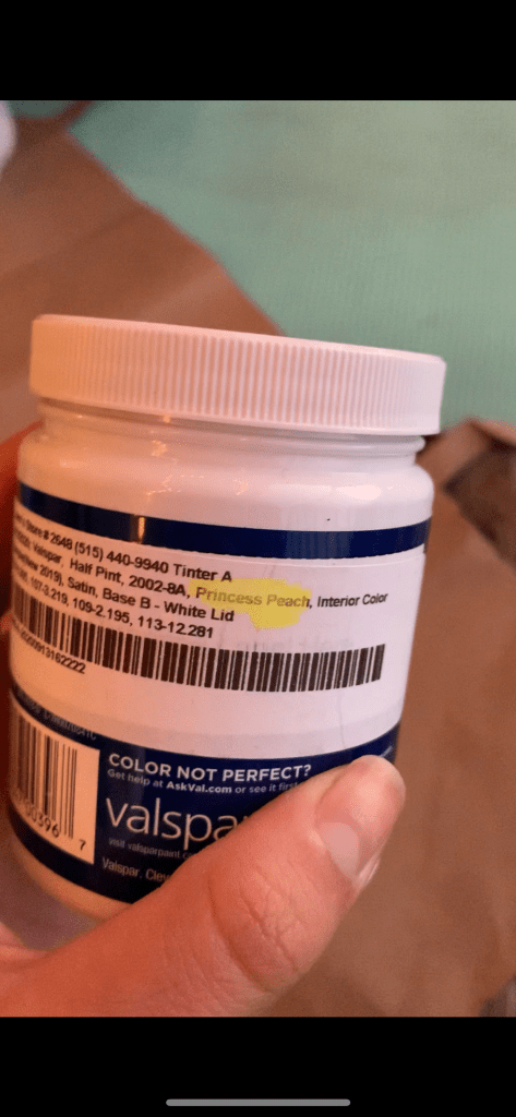 Here’s a pic of the paint I used – Princess Peach by Valspar available at Lowe’s was opaque enough for the blue pitcher!