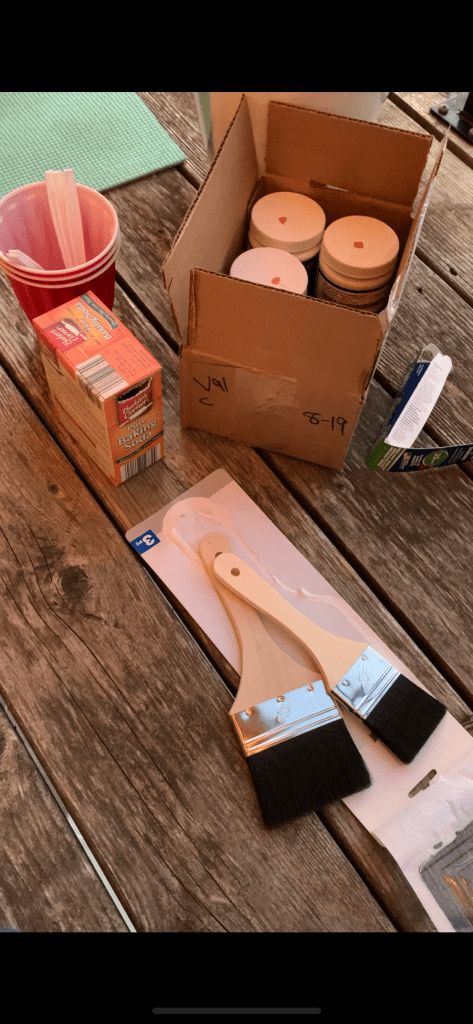 -supplies include: plastic spoons, plastic cups, paint brushes, paper bags or some kind of spill cloth